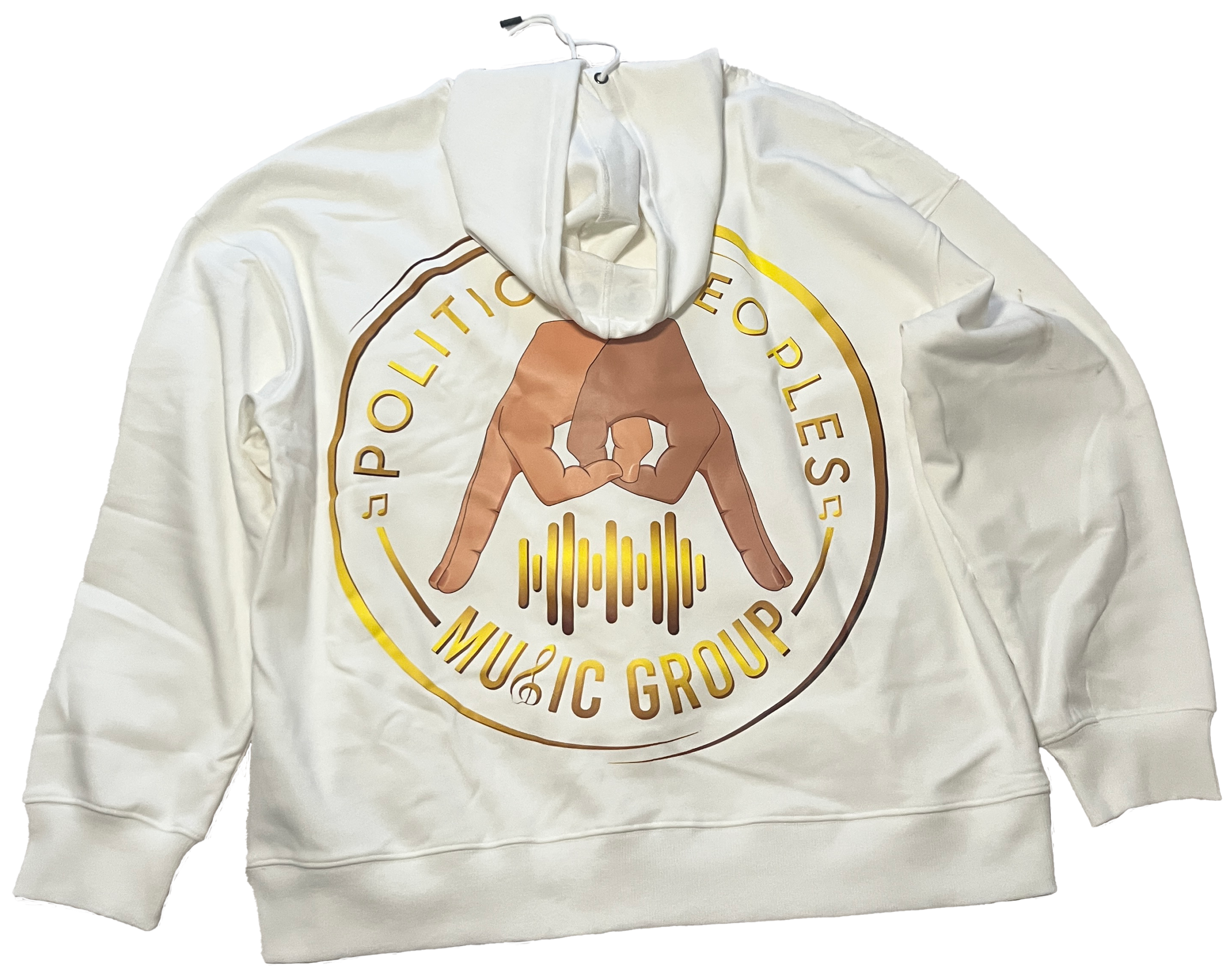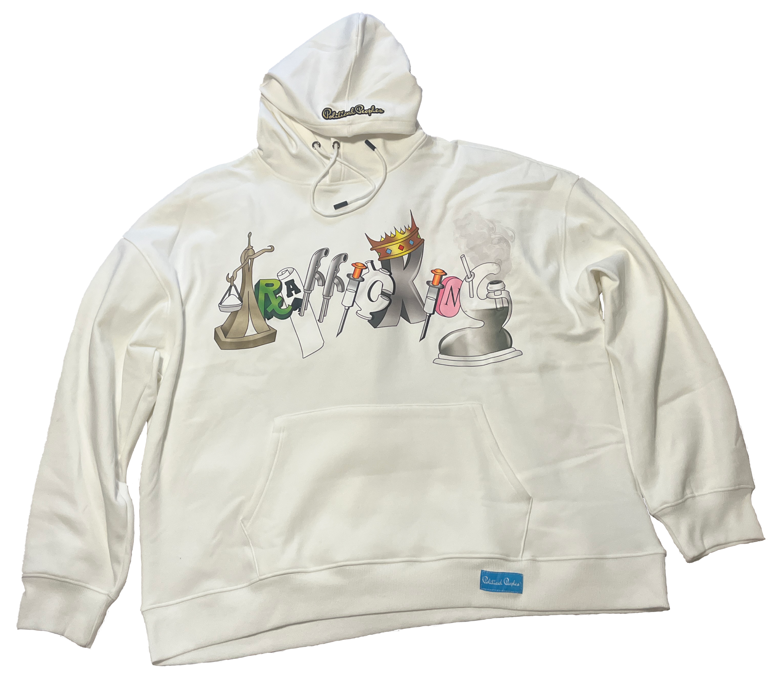 This Hoodie is a Collectors item from the Classic Trafficking Album by King Scarz. A white fleece with the authentic Political Peoples patch on the hood and the label logo on the back will show the support of the ones who jumped while supplies last.